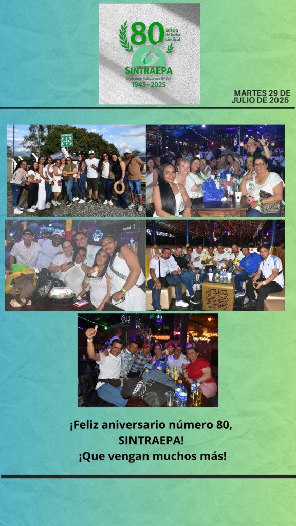 “¡80 años de historia, lucha y unión celebrados en una noche inolvidable! así celebramos 80 años de SINTRAEPA. Unidos como siempre, celebrando como nunca. ¡Gracias por hacer parte de esta historia! Cada sonrisa en esta fiesta es el reflejo de nuestra fuerza colectiva. ¡Feliz aniversario, SINTRAEPA!”